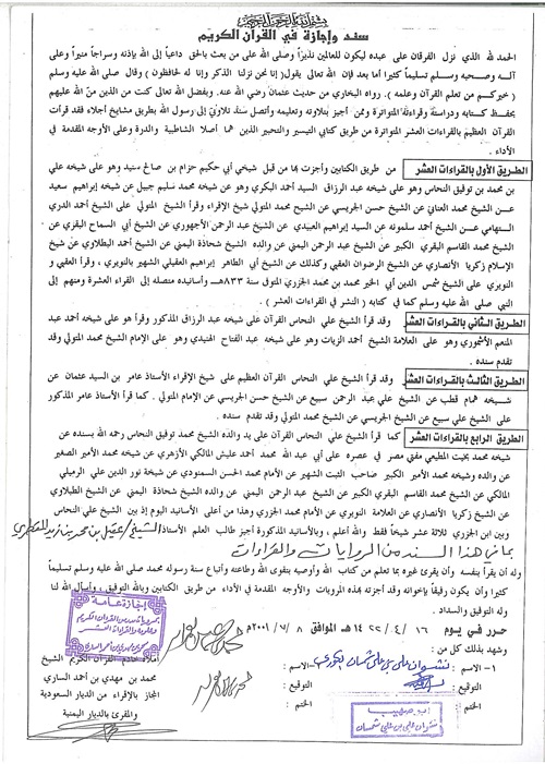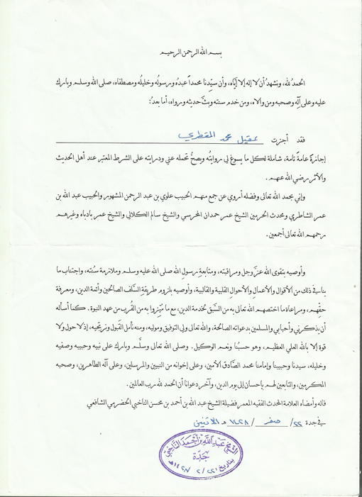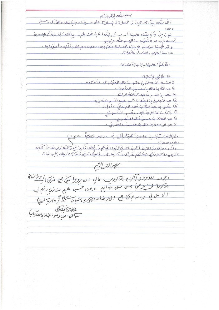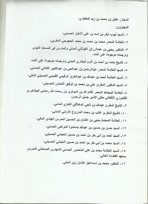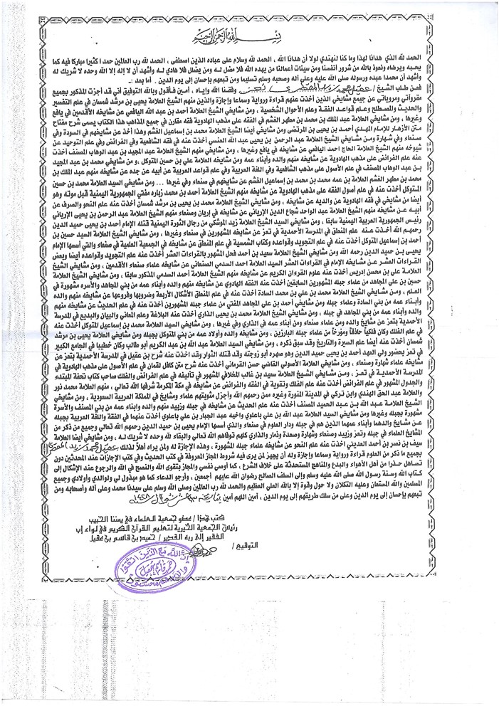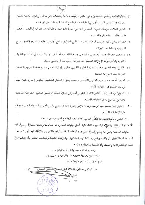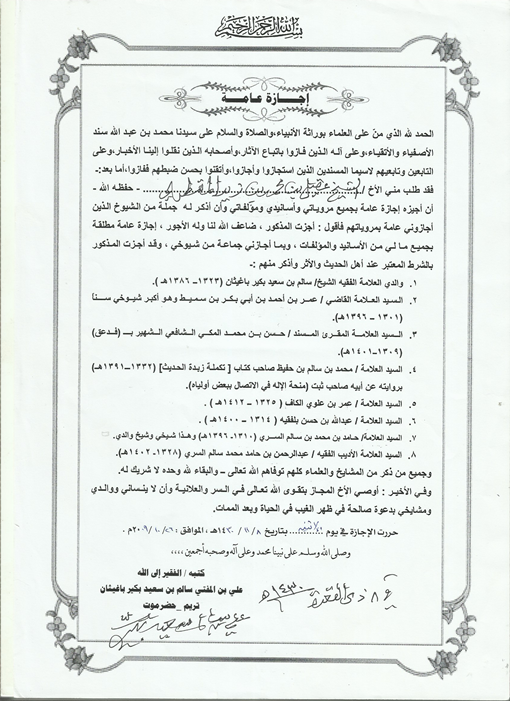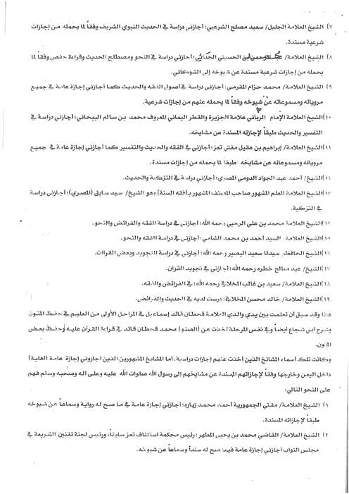 إجازة من الشيخ محمد بن يحي بن حمود الهجامإجازة من الشيخ محمد ببن زين العابدين الحلبيإجازة من الشيخ محمد بن مهدي الساري 3إجازة من الشيخ محمد بن مهدي الساريإجازة من الشيخ القاضي محمد بن إسماعيل العمرانيإجازة من الشيخ محمد بن عمر مقبول الأهدلإجازة من الشيخ عبد الله بن أحد الناخبيإجازة من الشيخ محمد الصادق المغلسإجازة من الشيخ سليمان بن محمد بن عبد الوهاب الأهدلإجازة من الشيخ محمد بن مهدي الساري 2إجازة من الشيخ علي بن المفتي سالم بن سعيد بكير باغيثانإجازة من الشيخ سالم بن علي رضوان بن إبراهيم السردحيإجازة من الشيخ علي سالم بكيرإجازة من الشيخ عبد الرحمن قحطان الفائشي العدينييتبع إجازة من الشيخ عبد الرحمن قحطان الفائشي العدينييتبع إجازة من الشيخ عبد الرحمن قحطان الفائشي العدينيإجازة من الشيخ عبد الرحمن بن إسماعيل الوشليإجازة من الشيخ أحمد عالي محمد عبد الرحمنإجازة من الشيخ محمد بن أحمد بن محمد الكبسيإجازة من الشيخ عباس بن أحمد الخطيب المتوكلإجازة من مجموعة من الشيوخإجازة من الشيخ حمود أحمد شميلةإجازة من الشيخ حميد أحمد عقيلإجازة من مجموعة من الشيوخإجازة من الشيخ حمود بن عباس المؤيدإجازة من مجموعة من الشيوخ